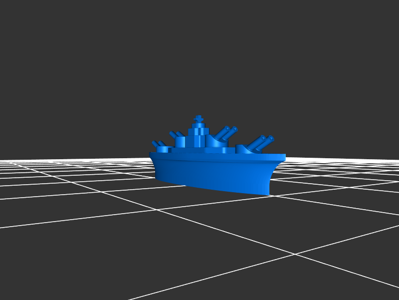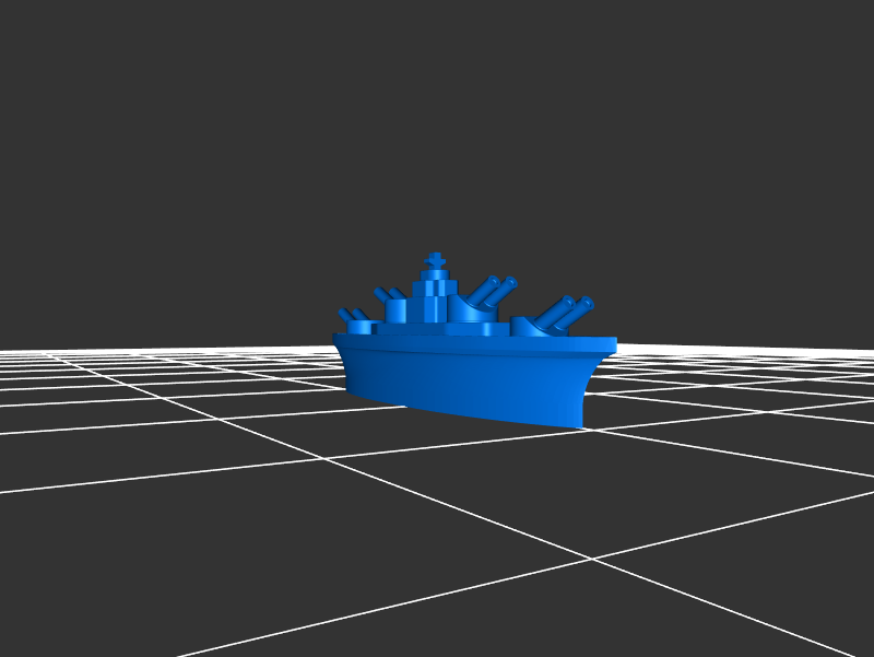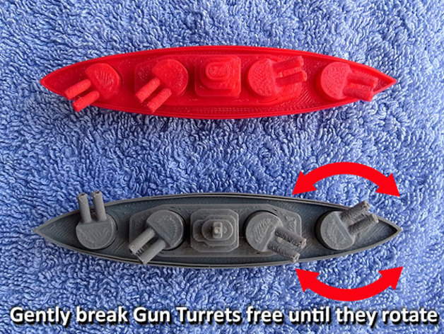 帶炮臺的現場戰艦戰艦,打印后一旦打開就會旋轉。標準尺寸的戰艦長11厘米。他們打印約。在復制器上使用90分鐘,在第5代復制器上使用2小時(使用24克長絲)。
